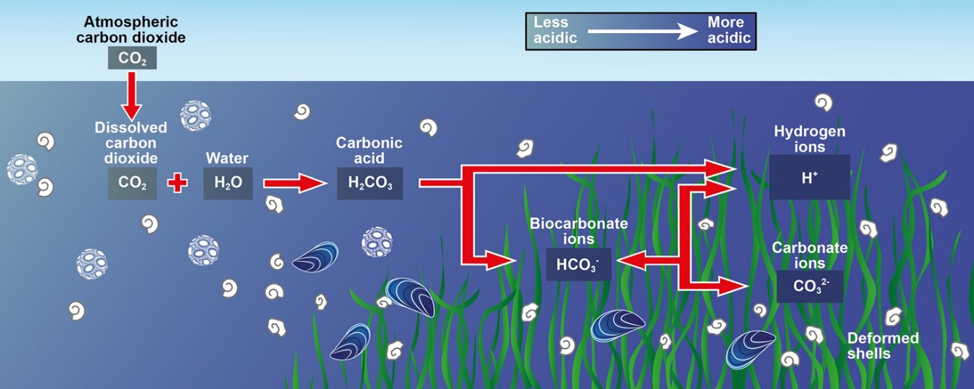 The ocean absorbs about 30% of the carbon dioxide (CO2) released to the atmosphere each year due to human activities. The CO2 absorbed by the ocean reacts with seawater, causing changes in the carbonate chemistry, a process referred to as ocean acidification. This dissolved CO2 reacts with seawater to form carbonic acid (H2CO3), which dissociates to form bicarbonate ions (HCO3-) and hydrogen ions (H+), while increasing the partial pressure of CO2 (pCO2). This reaction increases the concentration of hydrogen ions (H+) and lowers the pH of the seawater. The increased hydrogen ion concentration further decreases the amount of carbonate ions (CO32-) by forming bicarbonate (HCO3-), making carbonate ions relatively less abundant. The decrease in carbonate ion concentrations lowers the saturation state of biogenic calcium carbonate minerals, including calcite and aragonite, and can reduce the ability of organisms to calcify (e.g. reef building corals and shelled molluscs).