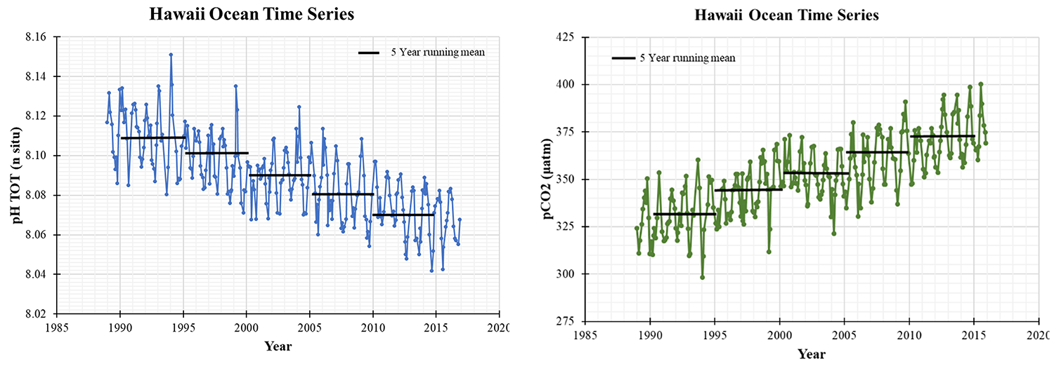 Sustained ocean time-series are critical for capturing trends in ocean acidification. Source: The Global Climate in 2015–2019, WMO 2019