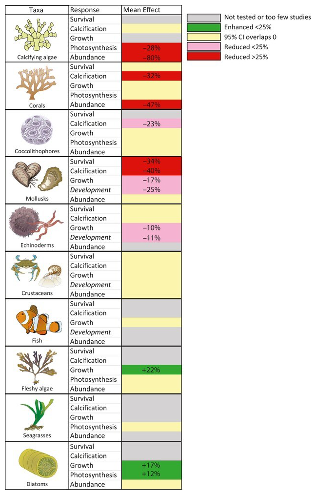 Summary of effects of acidification among key taxonomic groups. Effects are represented as either mean percent increase (+) or percent decrease (-) in a given response. Source: Kroeker et al 2013, Global Change Biology.